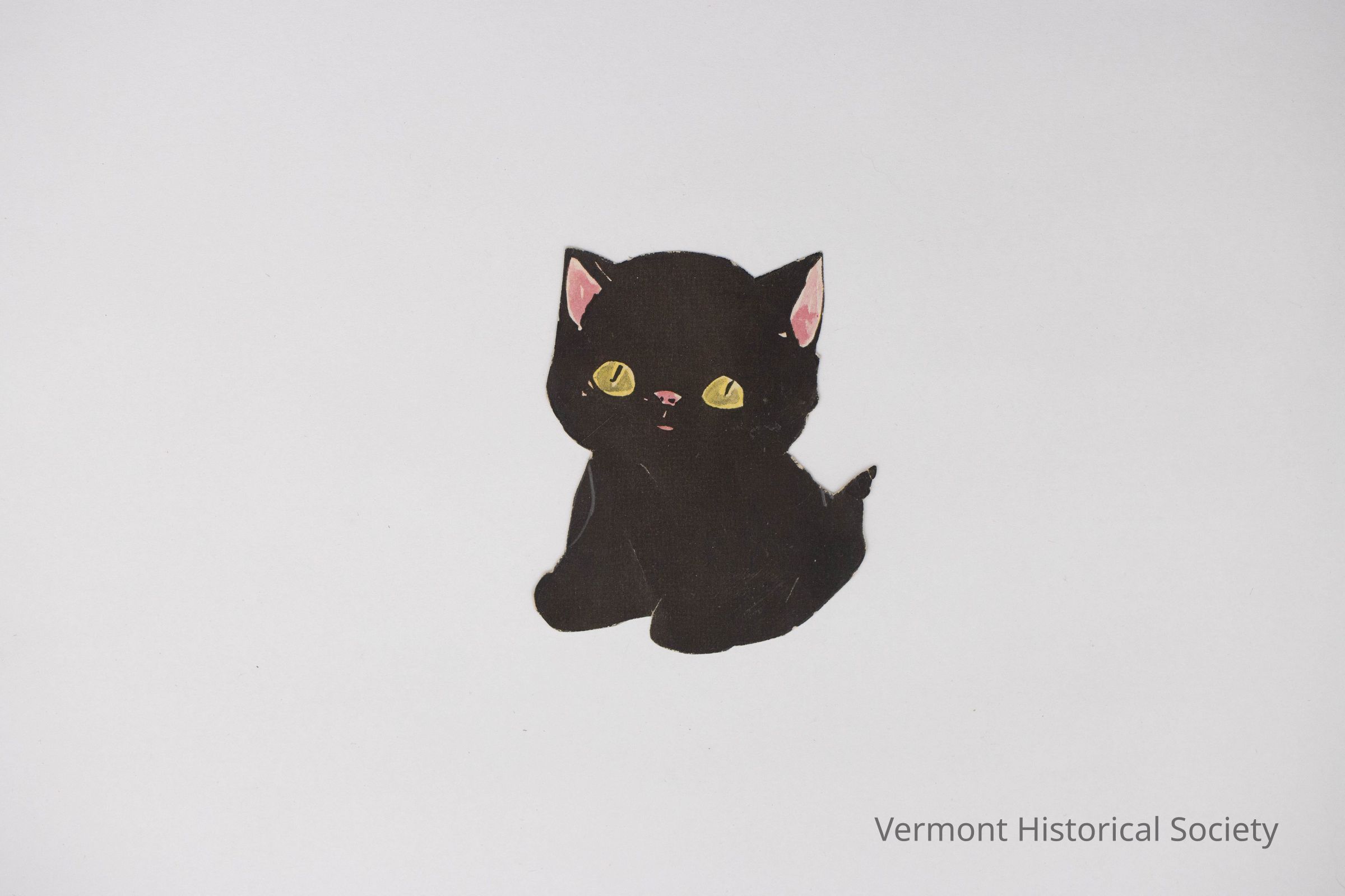 Printed paper doll in the shape of a black kitten with yellow eyes, a pink nose, and pink inner ears. The back shows a portion of a sales catalog page.Context