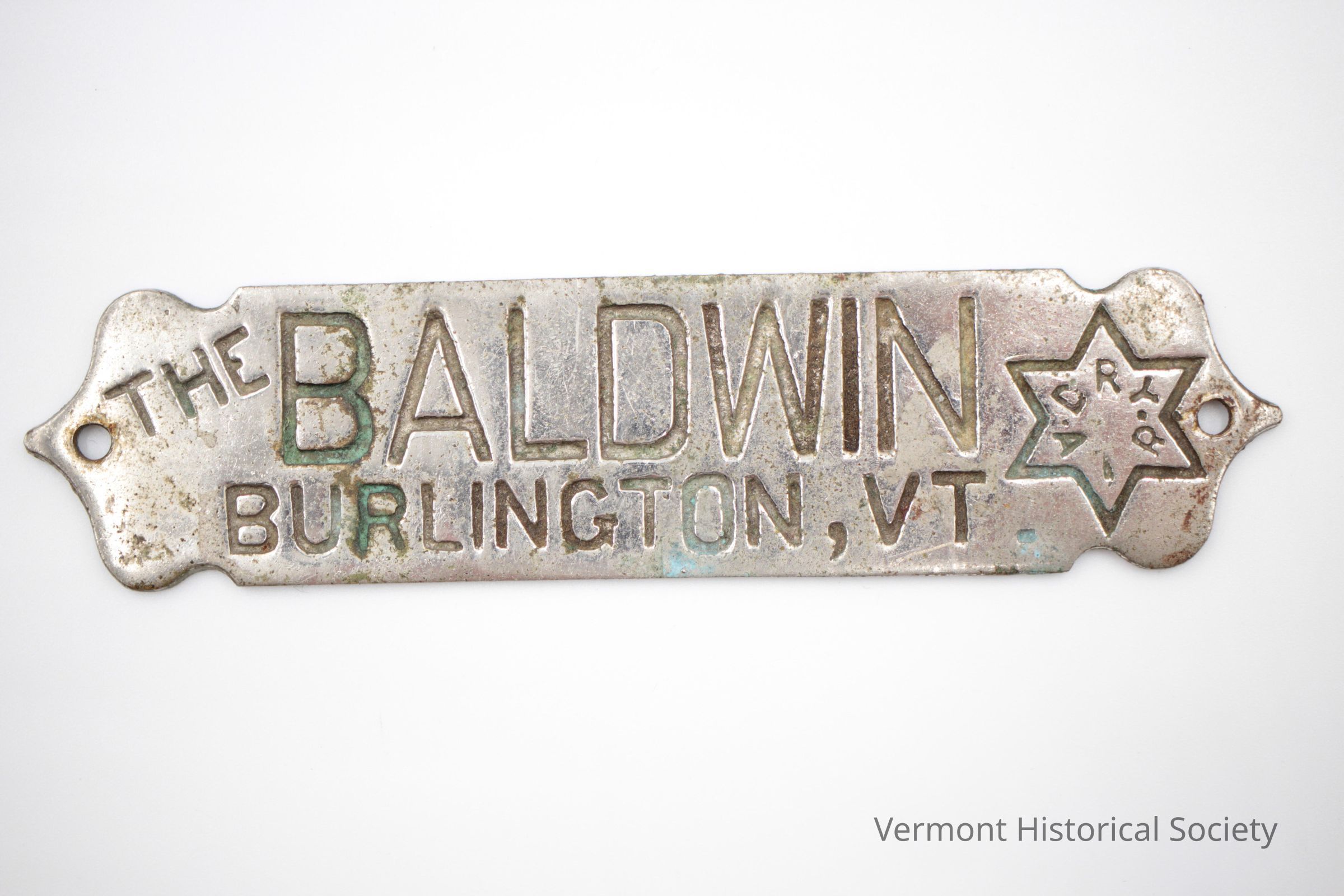 Small metal plaque with the inscription, "THE BALDWIN / BURLINGTON, VT". To the right of the inscription is a six-pointed star containing the words, "DRY AIR". There are small holes on either end of the plaque for mounting.Context