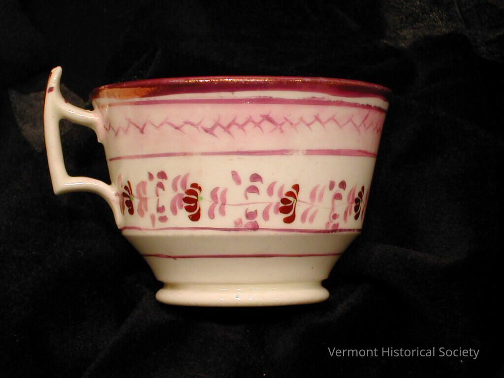 White-bodied ceramic tea cup with pink luster abstract floral design. The body of the cup is flared toward the lip and has a round pedestal base. The small handle is angular with a protruding tip. The design around the outside consists of a pink luster floral vine with red-petaled flowers beneath a pink chevron or scalloped border.