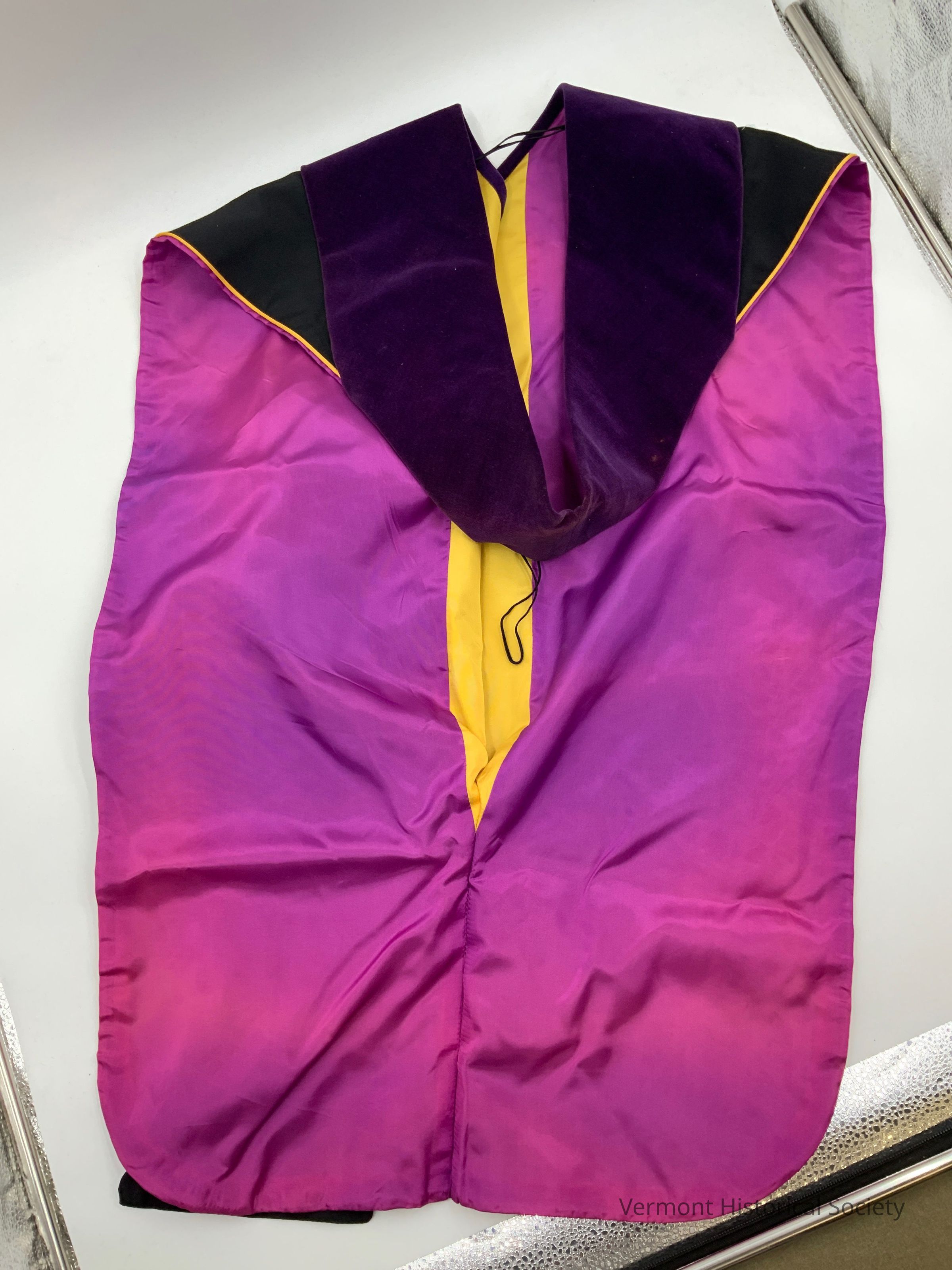 Academic hood. The outer fabric is black, and the lining is magenta with a yellow stripe. The lining has discolored to pink along fold lines. The opening edge is bound with purple velvet.