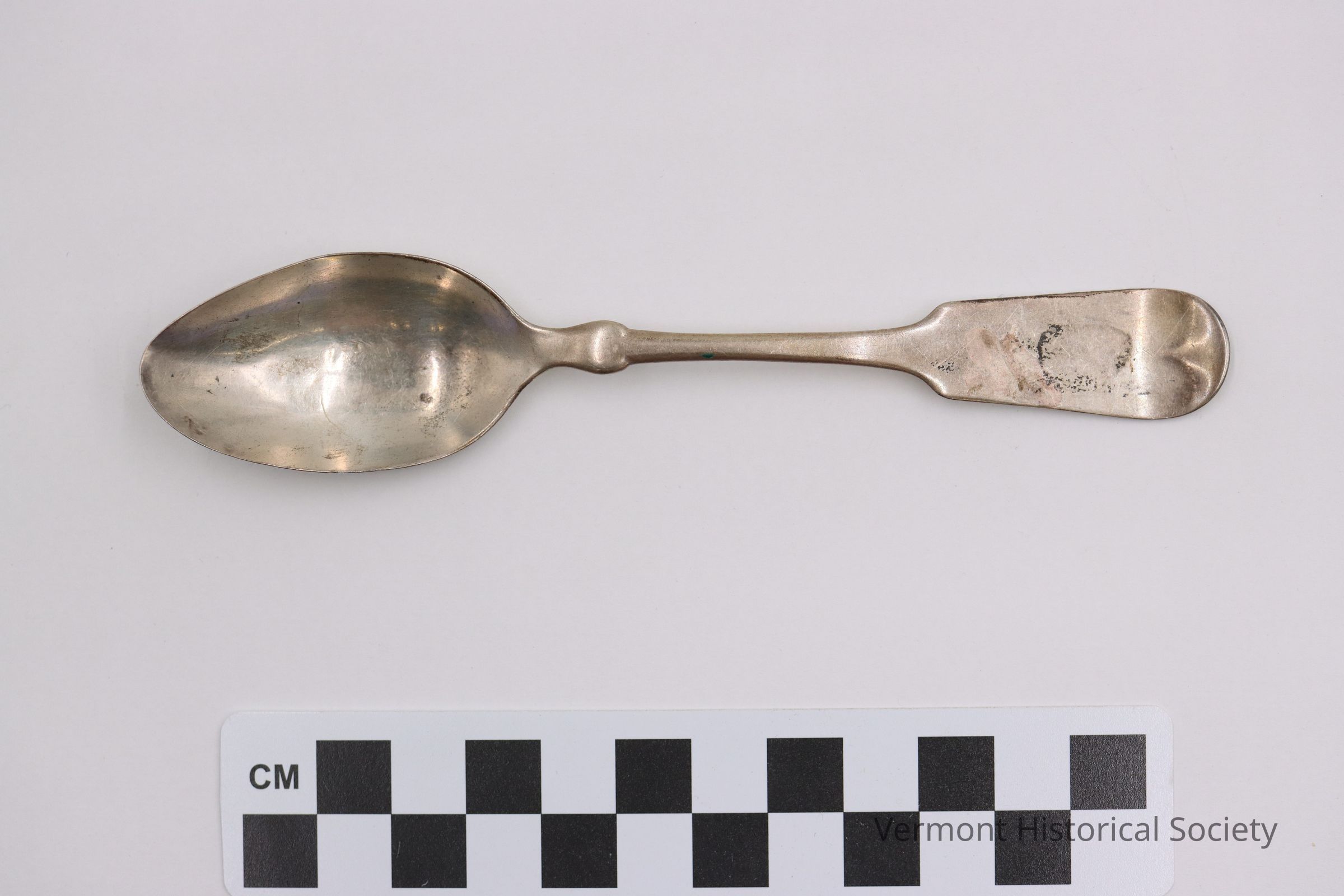 Silver teaspoon. The reverse of the handle is marked with the word "STERLING" and a W over an arrow.