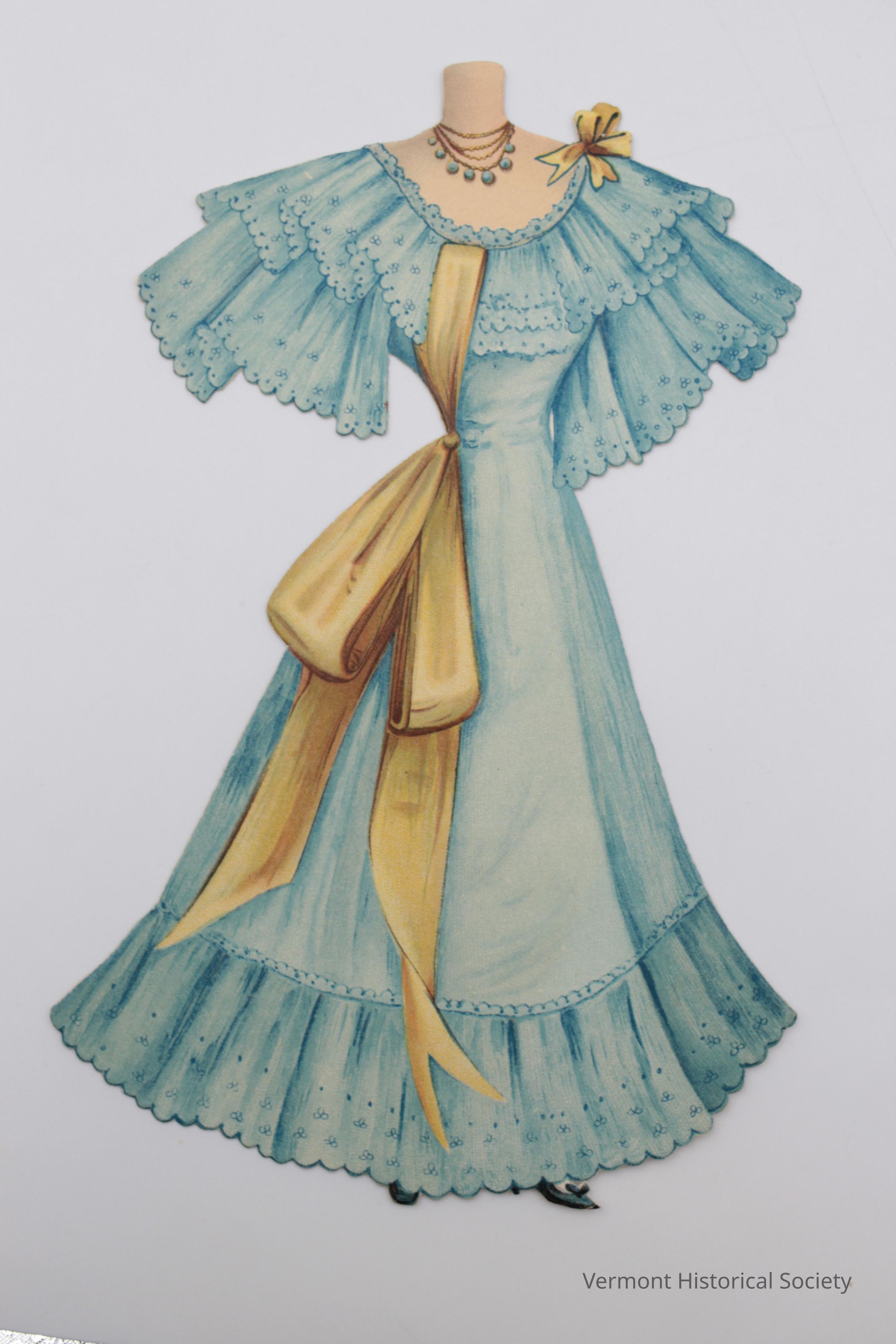 Light blue paper doll dress with voluminous ruffled sleeves. The dress comes to a very narrow waist, accented with a long yellow ribbon on the left side. The piece includes the neck and upper chest with a four-strand necklace.Context