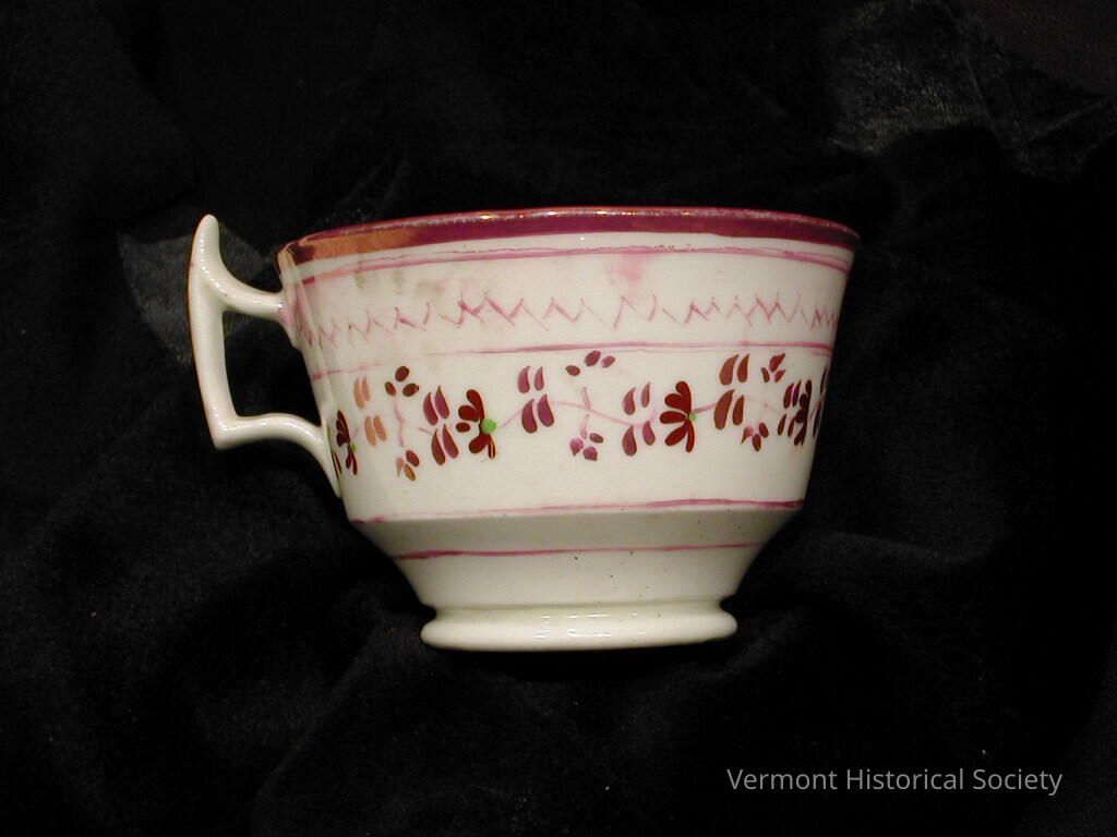 White-bodied ceramic tea cup with pink luster abstract floral design. The body of the cup is flared toward the lip and has a round pedestal base. The small handle is angular with a protruding tip. The design around the outside consists of a pink luster floral vine with red-petaled flowers beneath a pink chevron border.