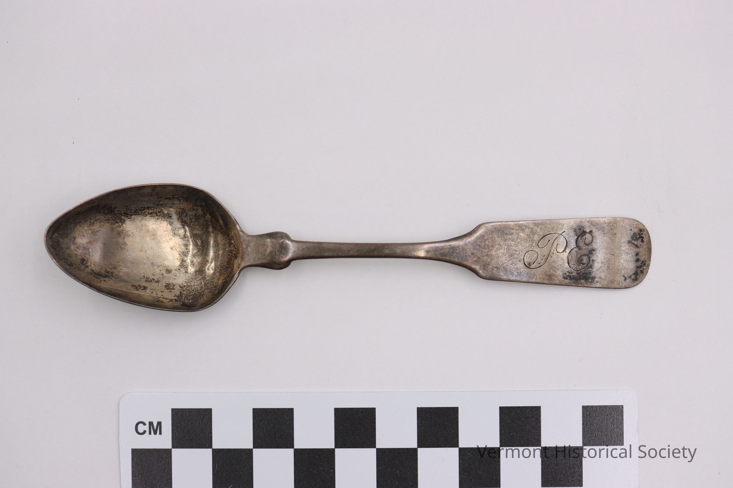 Silver teaspoon with the initials "PE" engraved on the handle. The reverse of the handle has a partially illegible mark that includes a lion rampant.