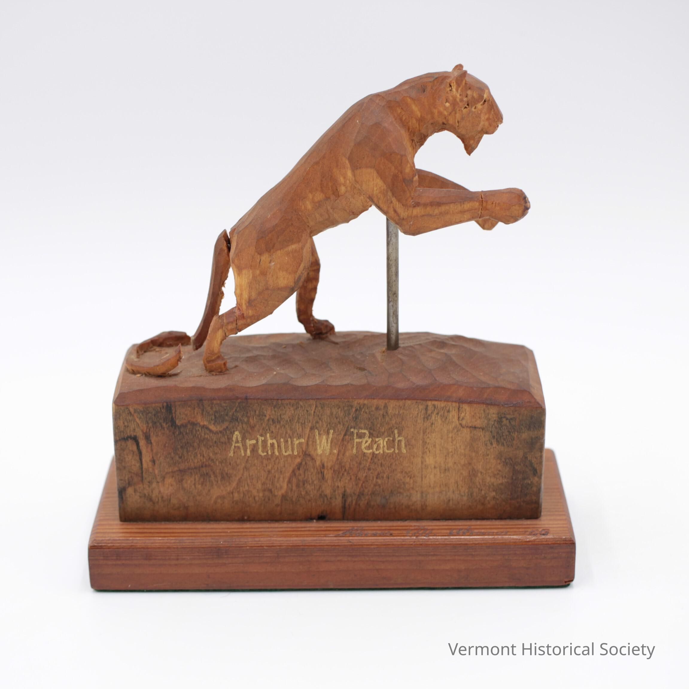 Wooden carving of a catamount, or mountain lion, leaping. The catamount is shown with its front paws off the ground and its tail curled on the ground behind it. The weight of its body is held up by a metal support. The tail is broken in two places and held in place by an interior wire. The base is rectangular, with a roughly carved top and smooth sides. It is labeled, "Arthur W. Peach". The tall base sits on a wider, but shorter rectangular base.Context