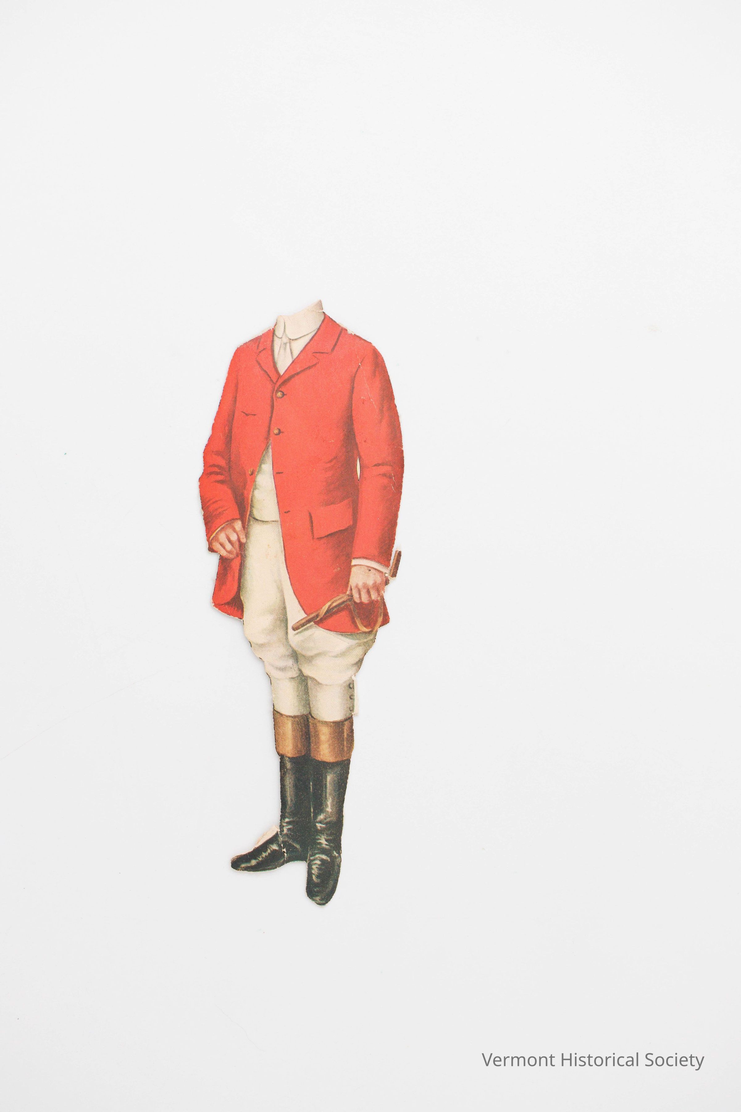 Mens' hunting suit for a paper doll. The suit consists of a red coat, white shirt, white vest, white pants, and black riding boots.Context