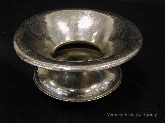 Small metal spittoon with wide, flared rim. The circular body of the spittoon is short. The body and the rim attach in a narrow circle.