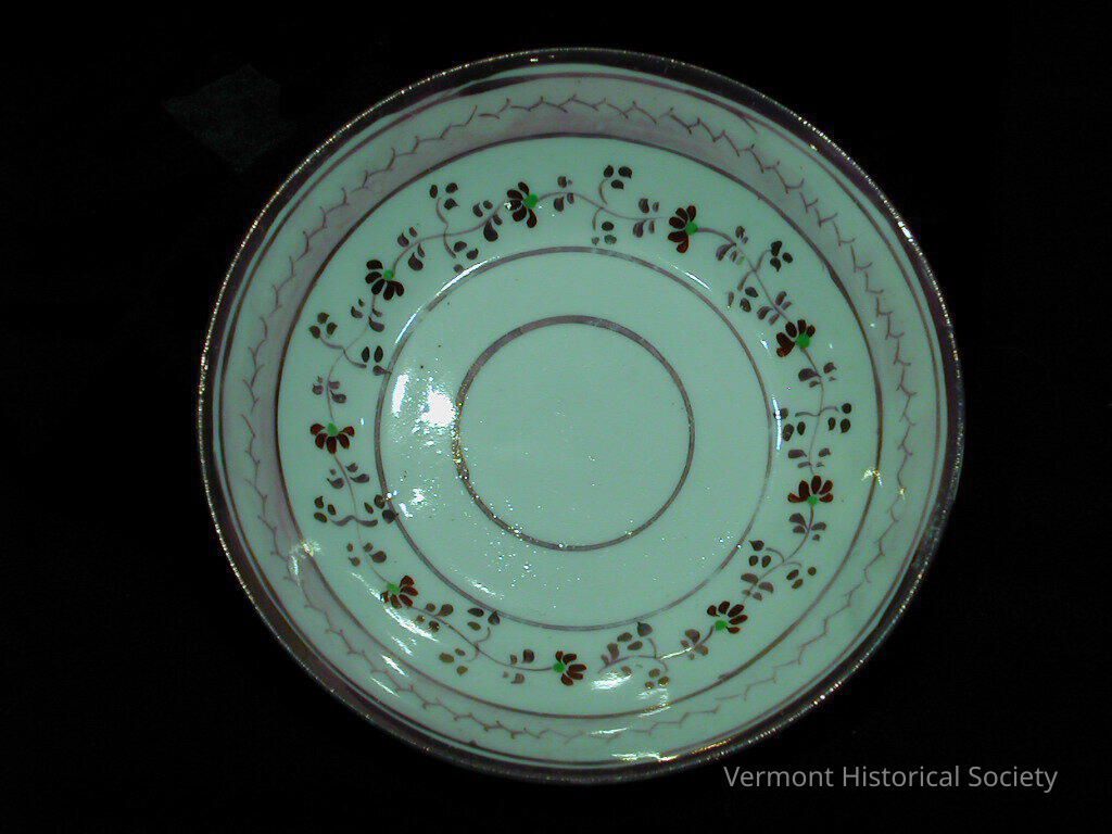 White-bodied ceramic saucer with pink luster abstract floral design. The design consists of concentric pink luster circular bands. Within the outermost two bands are a hatched or chevron-shaped vine and a more naturalistic vine with pink leaves and red-petaled flowers.