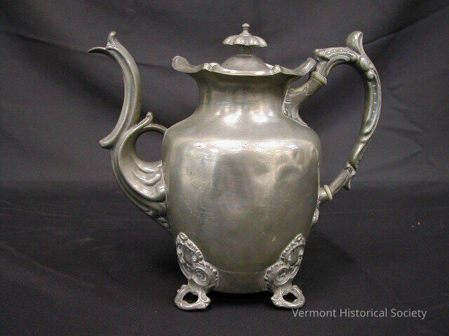 Pewter coffeepot with lid. The bot sits on four, highly stylized legs with a trefoil attachment. The handle and spout are both curved in a rococo revival style. The lid sits inside a flared, raised rim, and has a large floral finial. The pot is vasiform. The bottom is marked, "James Dixon & Sons".