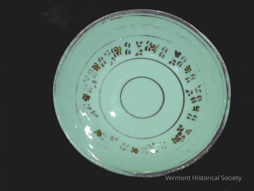 White-bodied ceramic saucer with pink luster abstract floral design. The design consists of concentric pink luster circular bands. Within the outermost two bands are a hatched or chevron-shaped vine and a more naturalistic vine with pink leaves and red-petaled flowers.