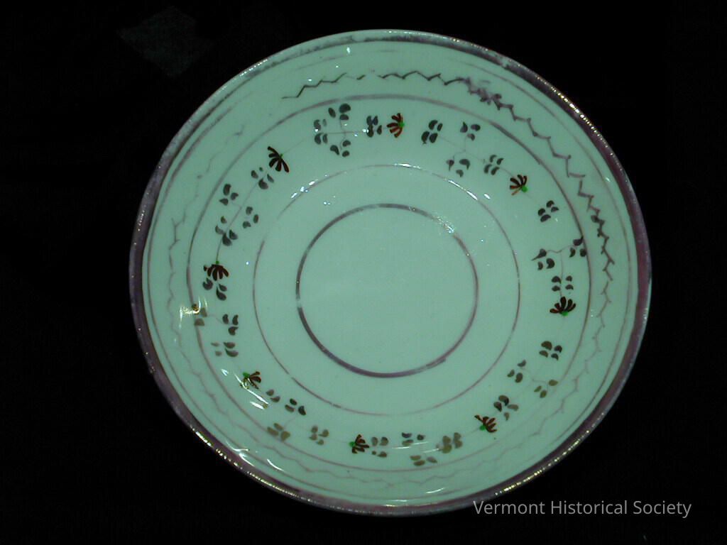 White-bodied ceramic saucer with pink luster abstract floral design. The design consists of concentric pink luster circular bands. Within the outermost two bands are a hatched or chevron-shaped vine and a more naturalistic vine with pink leaves and red-petaled flowers.