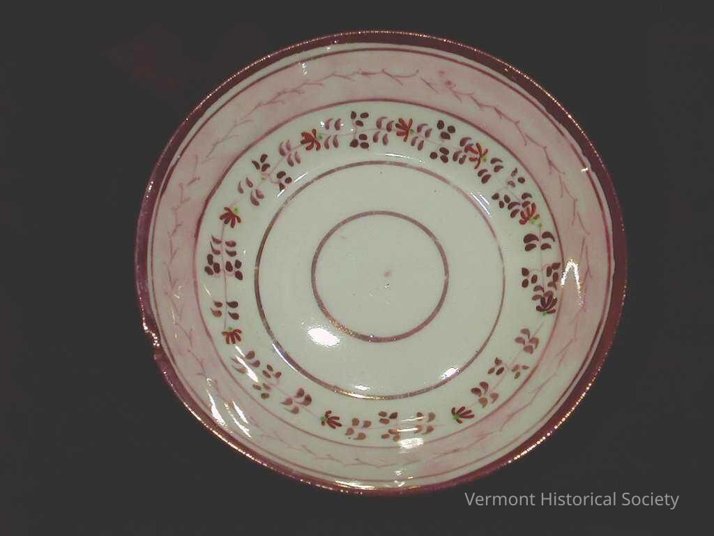 White-bodied ceramic saucer with pink luster abstract floral design. The design consists of concentric pink luster circular bands. Within the outermost two bands are a hatched or chevron-shaped vine on a pink ground and a more naturalistic vine with pink leaves and red-petaled flowers on a white ground.