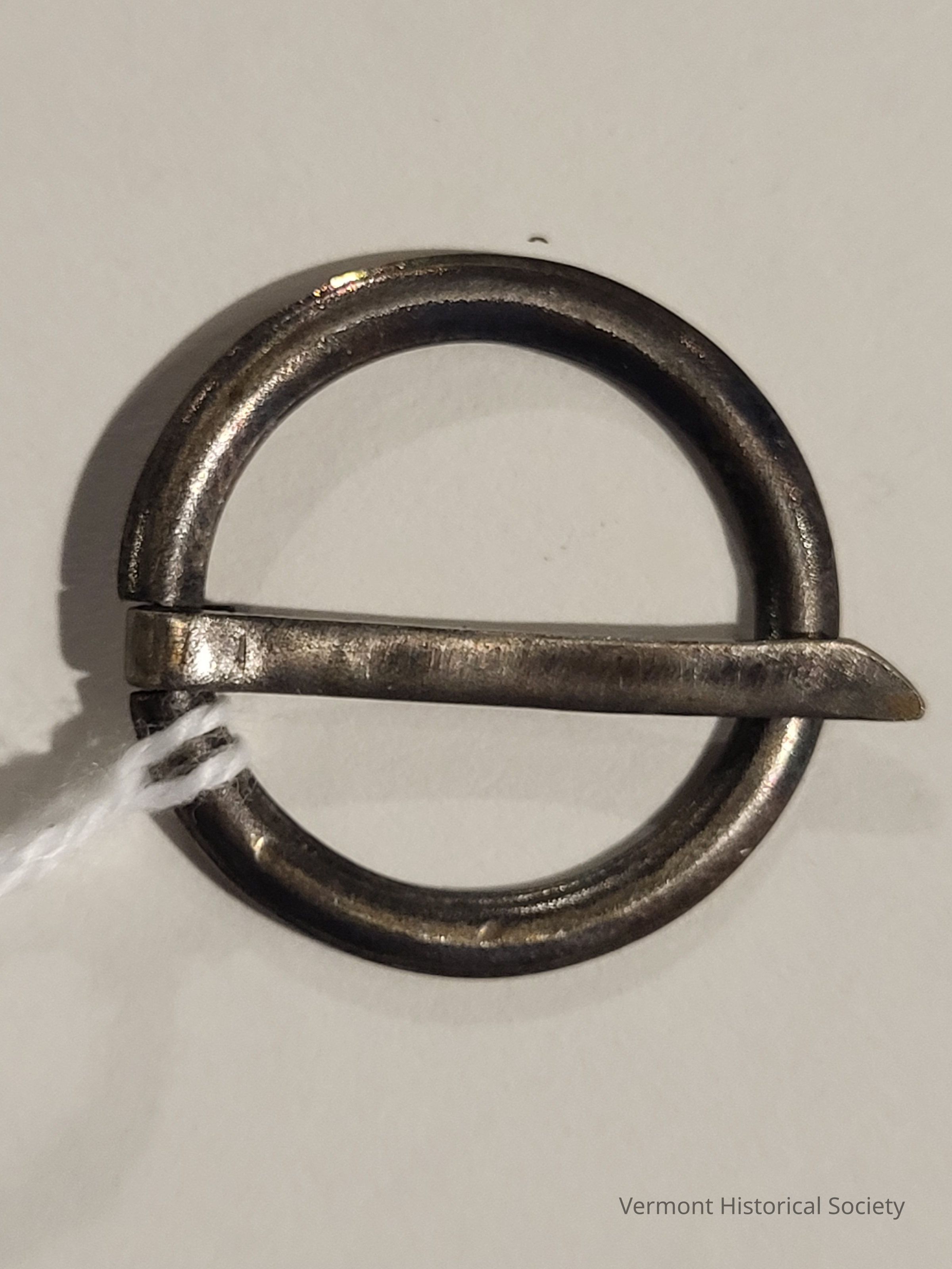 Ring brooch. The brooch comprises a slightly curved metal ring with a notched section on one outer edge to secure a pin that has been wrapped around the thinned part.Item Type