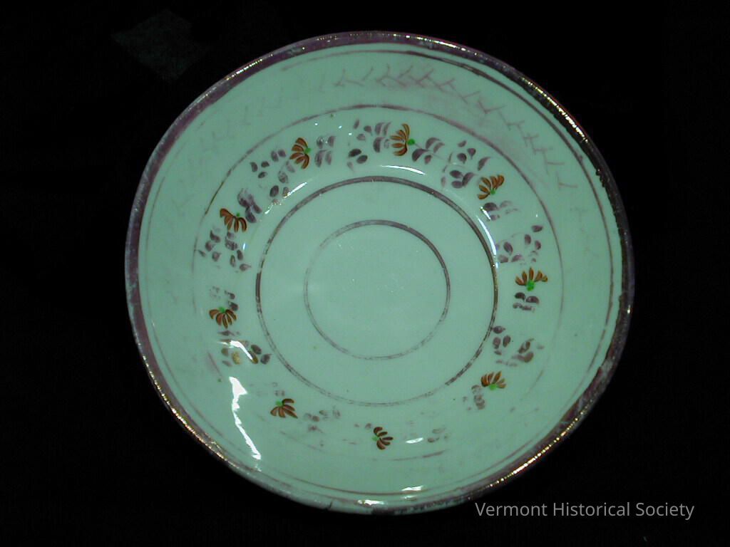 White-bodied ceramic saucer with pink luster abstract floral design. The design consists of concentric pink luster circular bands. Within the outermost two bands are a hatched or chevron-shaped vine and a more naturalistic vine with pink leaves and red-petaled flowers.