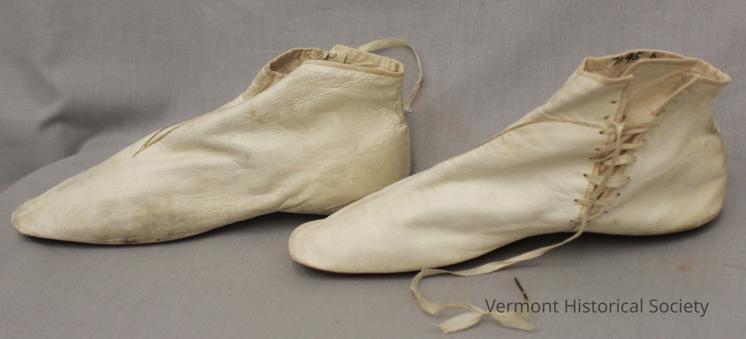 White leather shoes that lace up the outer side, even with the ankle. They have a square toe and shaped leather sole. There is a handwritten label on one sole that reads, "Great Aunt Anna Clements wedding shoes," and on the other sole that reads, "Wedding shoes Anna Elisabeth Clement Sister of Governor Percival Clement married Edson P. Gilson June, 1865 Rutland, Vermont."Context