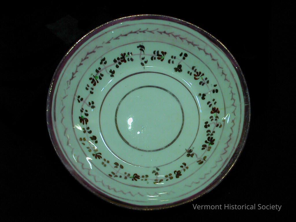 White-bodied ceramic saucer with pink luster abstract floral design. The design consists of concentric pink luster circular bands. Within the outermost two bands are a hatched or chevron-shaped vine and a more naturalistic vine with pink leaves and red-petaled flowers.