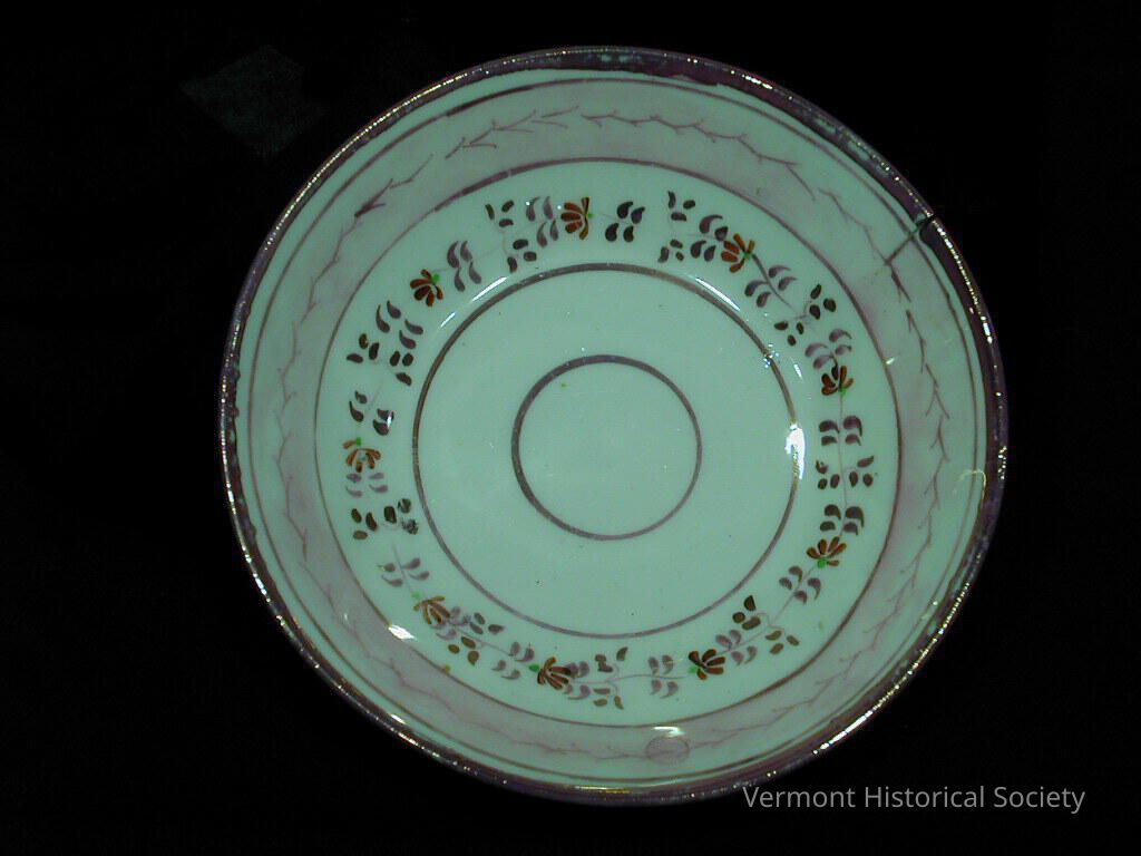 White-bodied ceramic saucer with pink luster abstract floral design. The design consists of concentric pink luster circular bands. Within the outermost two bands are a hatched or chevron-shaped vine and a more naturalistic vine with pink leaves and red-petaled flowers.