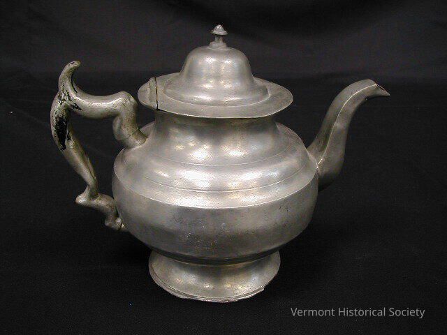 Pewter teapot. The pot has a circular foot and narrow neck. The body has a compressed lower bulge, incurved neck, and flared collar. The dome lid has a central acorn finial handle. The handle has remnants of paint from being painted black in imitation of ebony. The bottom of the pot is marked "J.W. Cahill & Co. / 2".