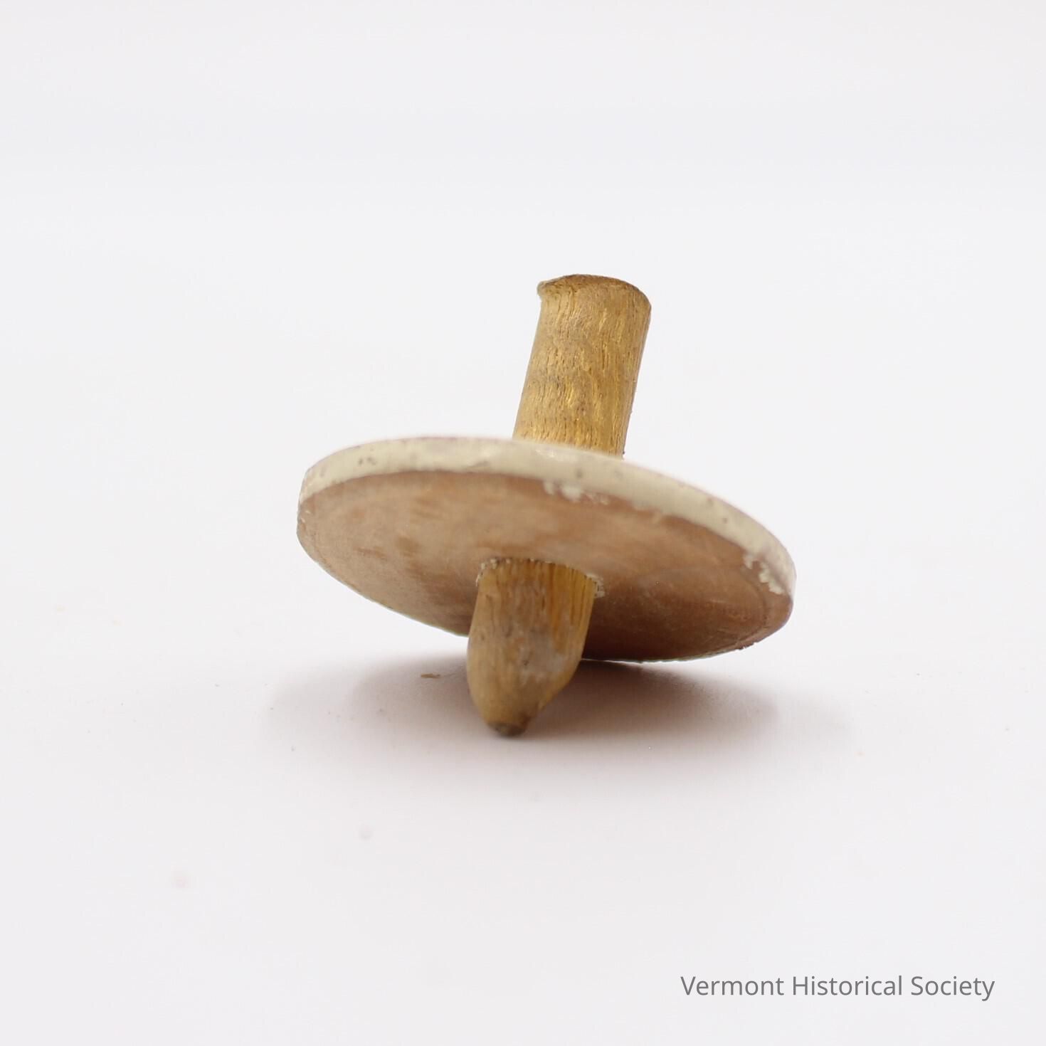 Small, unpainted wooden top consisting of a pointed dowel inserted through the center of a wooden disk.