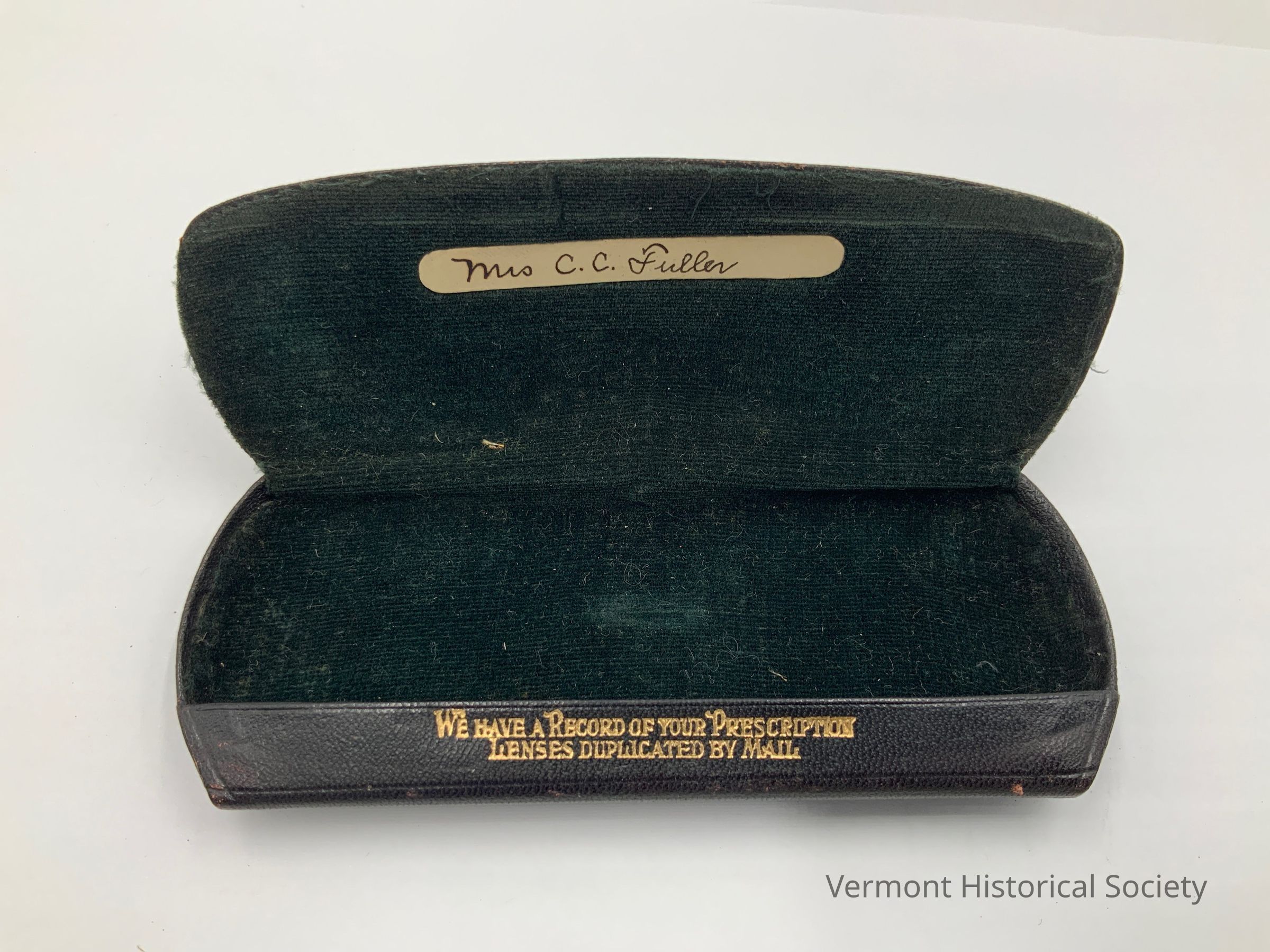 Leather eyeglass case lined with velvet. A label on the inside of the case reads "Mrs. C. C. Fuller". The outside of the case reads, "Dr. GILBERT RIST 53 Church St. BURLINGTON, Vt." and "WE HAVE A RECORD OF YOUR PRESCRIPTION LENSES DUPLICATED BY MAIL."