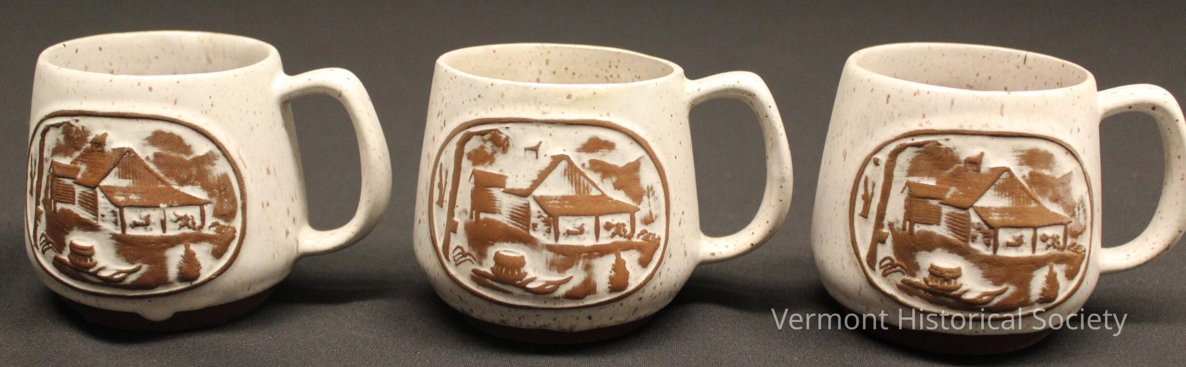Clay mug with brown-speckled white glaze and a handle. One side of the cup is molded with a picture of a cabin and a sled within an oval frame, and the raised image is painted brown. The bottom of the mug is unglazed, showing the red/brown ceramic body and is stamped with the maker's mark, "goss crafted in Vermont". A piece of masking tape on the bottom reads, "Archives Sample Nov 1976".Context