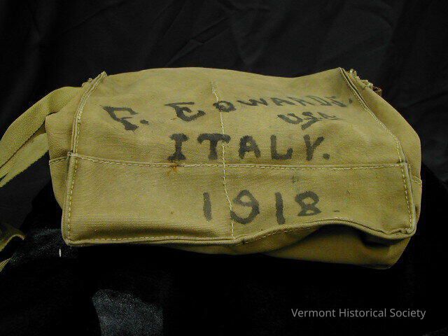Olive green canvas haversack. The haversack closes with a flap that covers the entire front side. The bag closes with a flap that reaches from the top back to the bottom front, and secures with a buckle. There are two metal rings at the top back, to which a long cotton webbing strap attaches with hooks. The flap is stamped with the number 3 on the outside, and 260 on the inside. The back of the bag is painted with the label, "F. EDWARDS U.S.A. ITALY. 1918." The label is superimposed over a lighter name that begins with "Mc".Context
