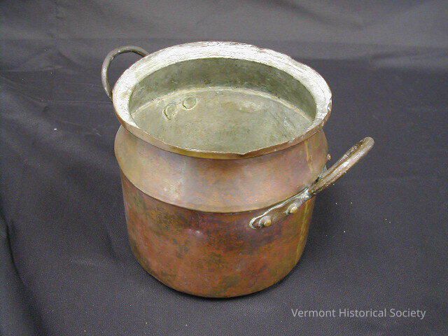 Copper milk can. The can has two U-shaped handles. The top opening comes inward at the neck, then flares outward.