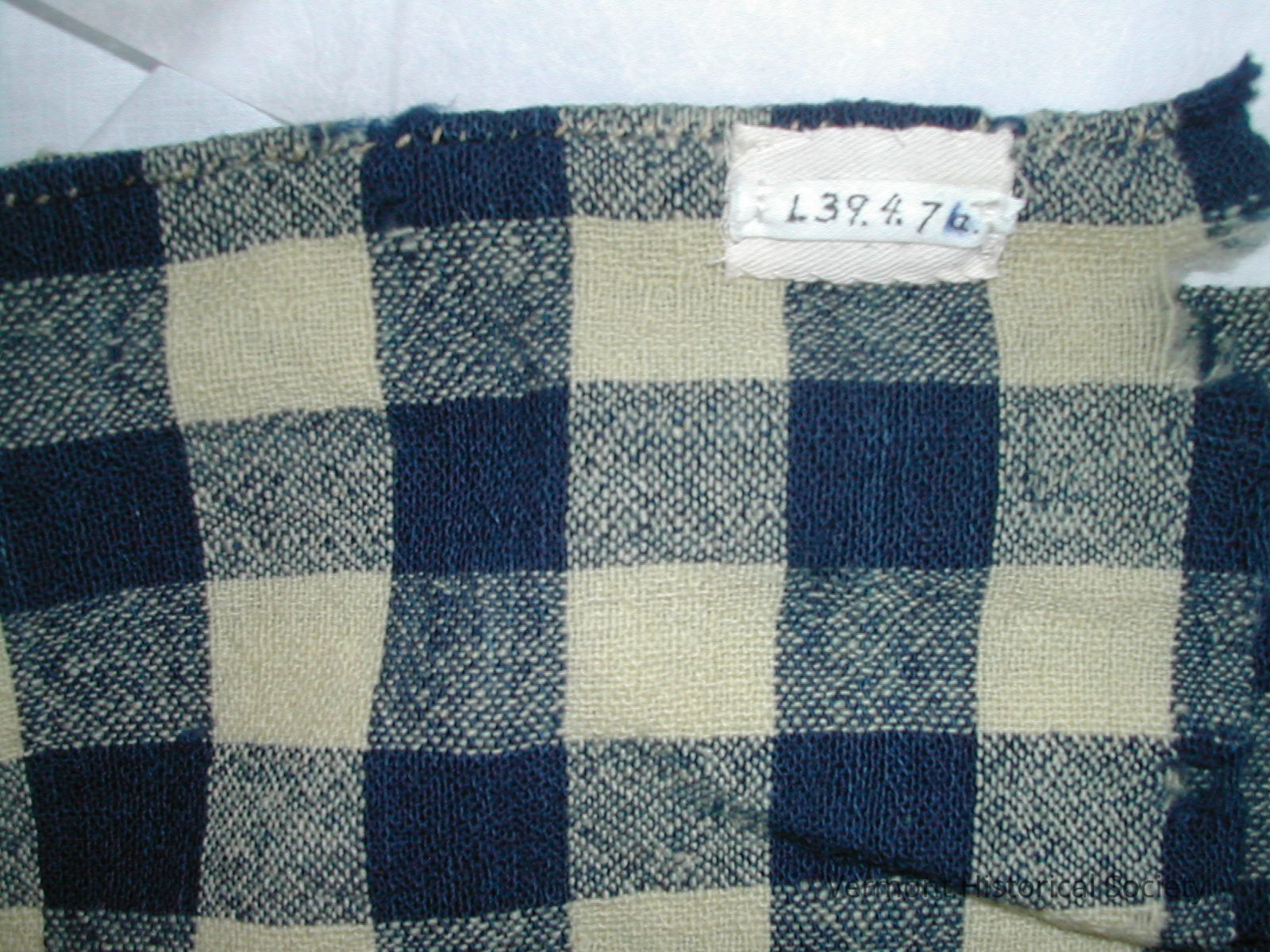 "Wool Singles, plain weave construction, One-inch check indigo blue and natural wool. Warp and weft hand spun singles, hemmed on edges. Simple and type of blankets in mid-19th century. Darned."Acquisition
