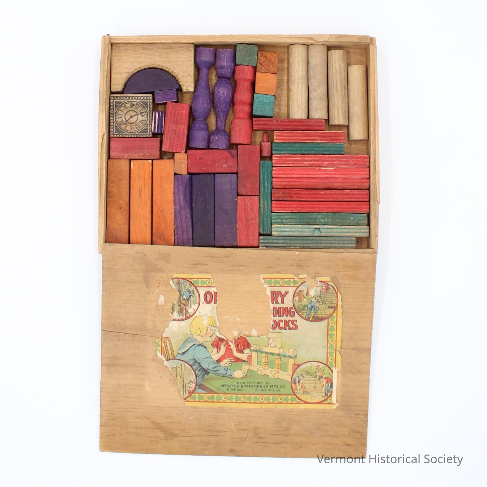 Wooden box containing wooden blocks. The sliding lid of the box has the remnants of a sticker showing an illustration of children building a structure with the blocks and adults doing construction. The box contains one unpainted arch block, one square block printed with a clock face, four unpainted cylindrical blocks, four cube blocks (red, orange, blue, green), a red baluster, two purple balusters, and several rectangular blocks in red, purple, green, and orange. Some of the blocks have decorative beading on side.Context
