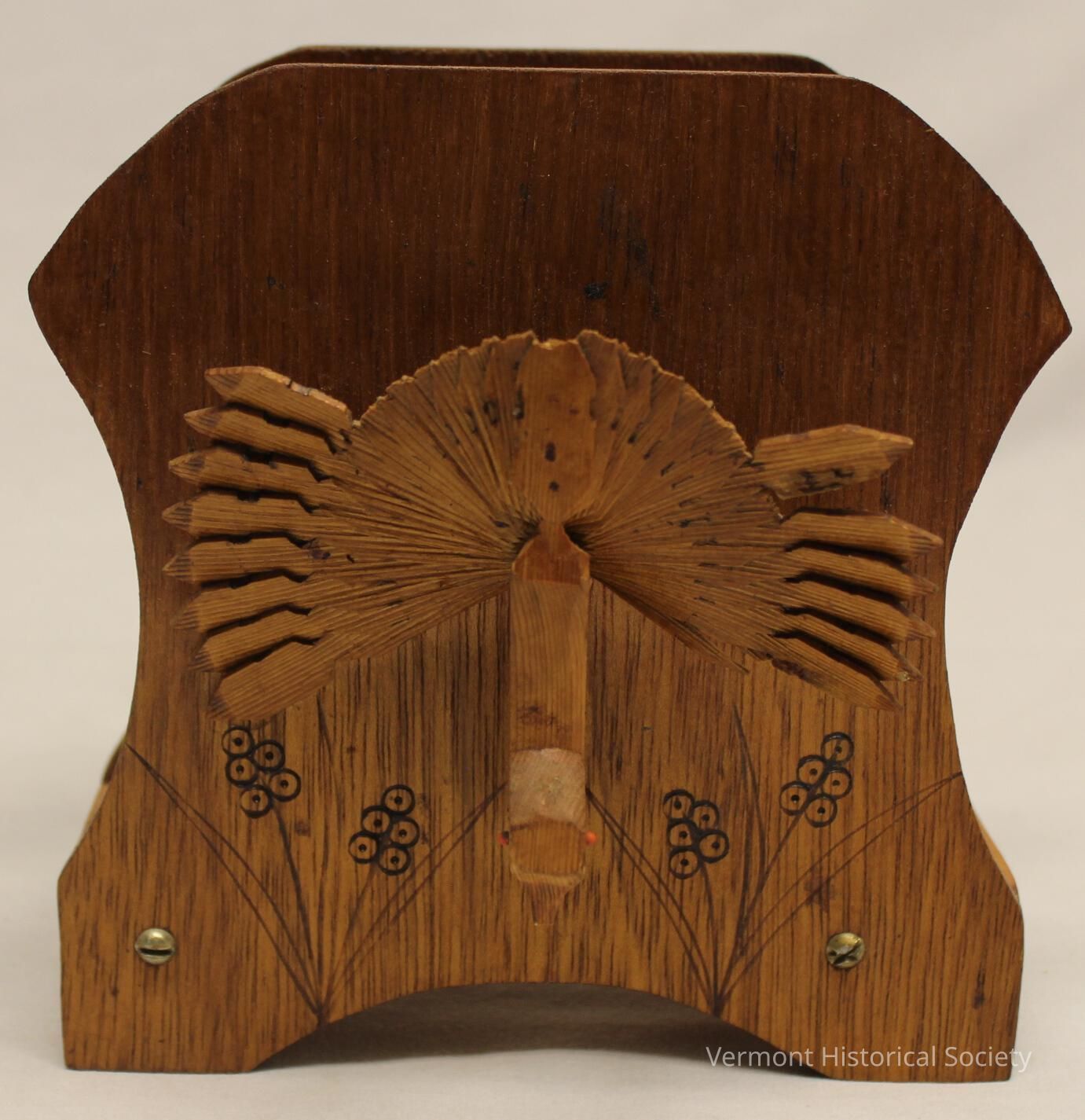 Wooden napkin holder with the fan-tailed bird carvings attached on either side. The sides also have carvings in the wood of round flowers with leaves. The sides are attached to the base with screws. These carvings are made from one piece of cedar, which is then fanned out to form the tail.Context