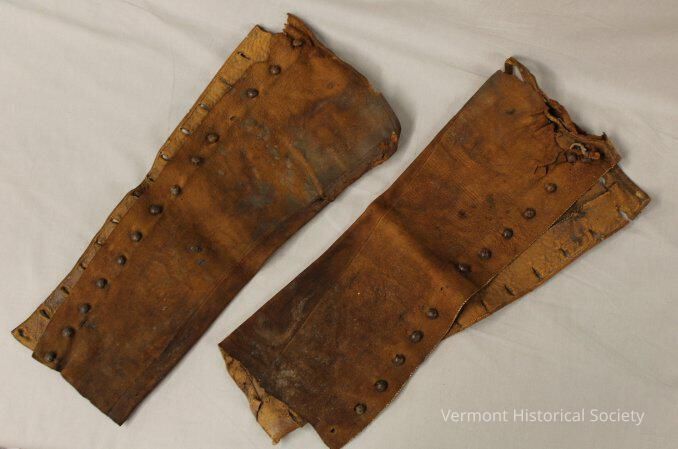 Pair of leather leggings. Each legging secures down its length with 14 knotted leather buttons. The leggings are slightly shaped to the wearer's shin, and extend from the ankle to just below the knee.