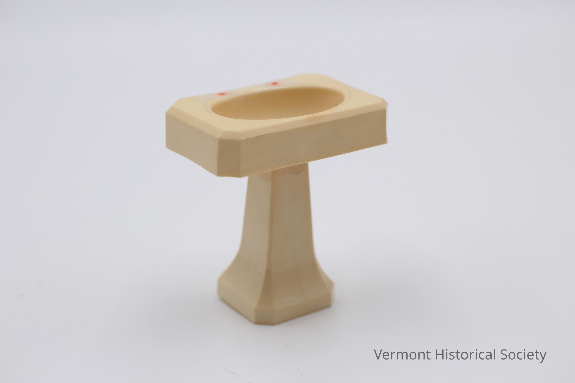 Miniature plastic pedestal sink with an oval reservoir and rectangular top. The pink plastic handles are missing.Context