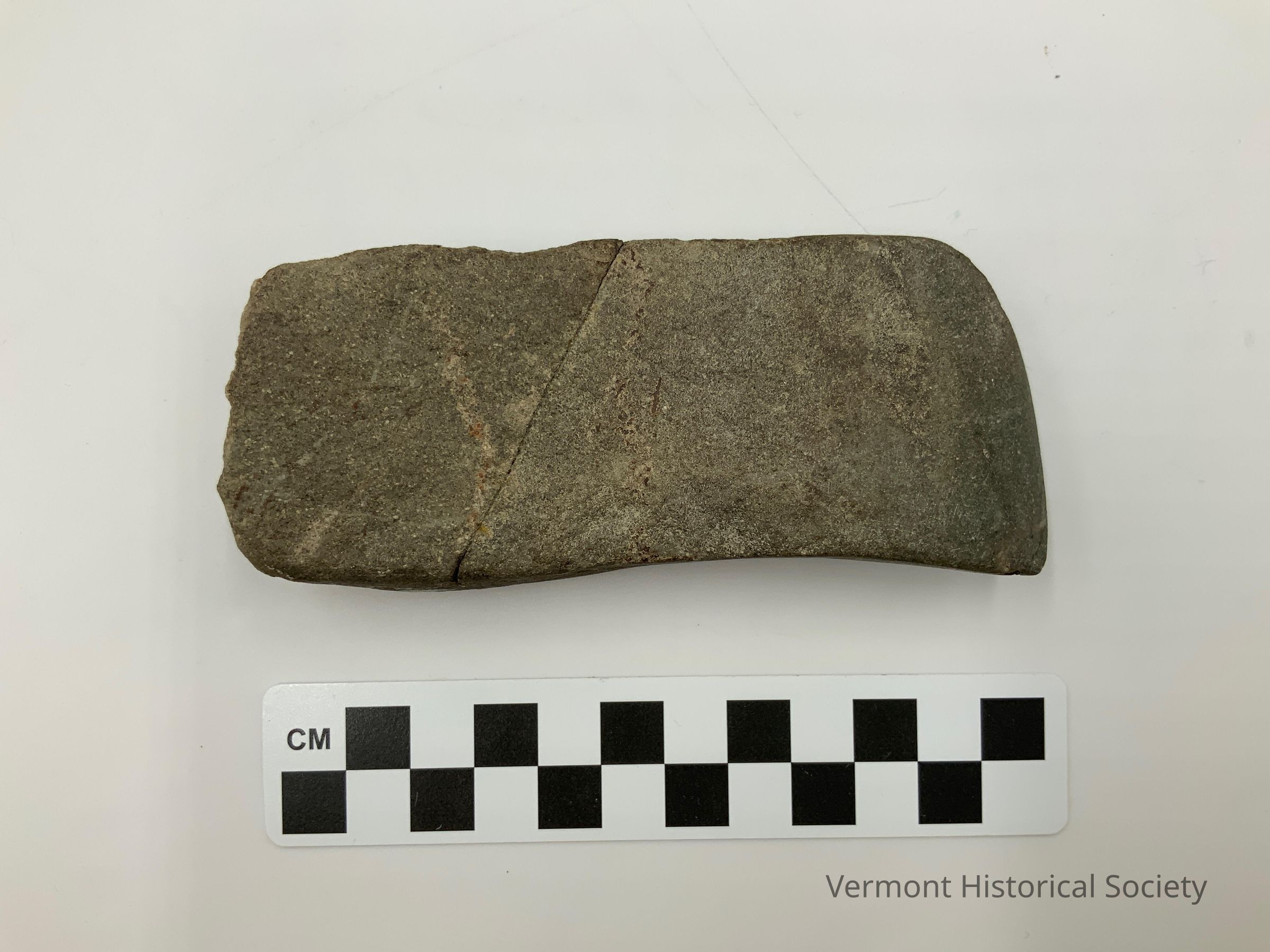 Ground stone celt made of sandy quartzite. It is completely ground. The proximal end is flat, and the distal end is polished to a sharp blade. The body is thinner along the midsection. There is a straight break diagonally across the center that has been repaired.Context