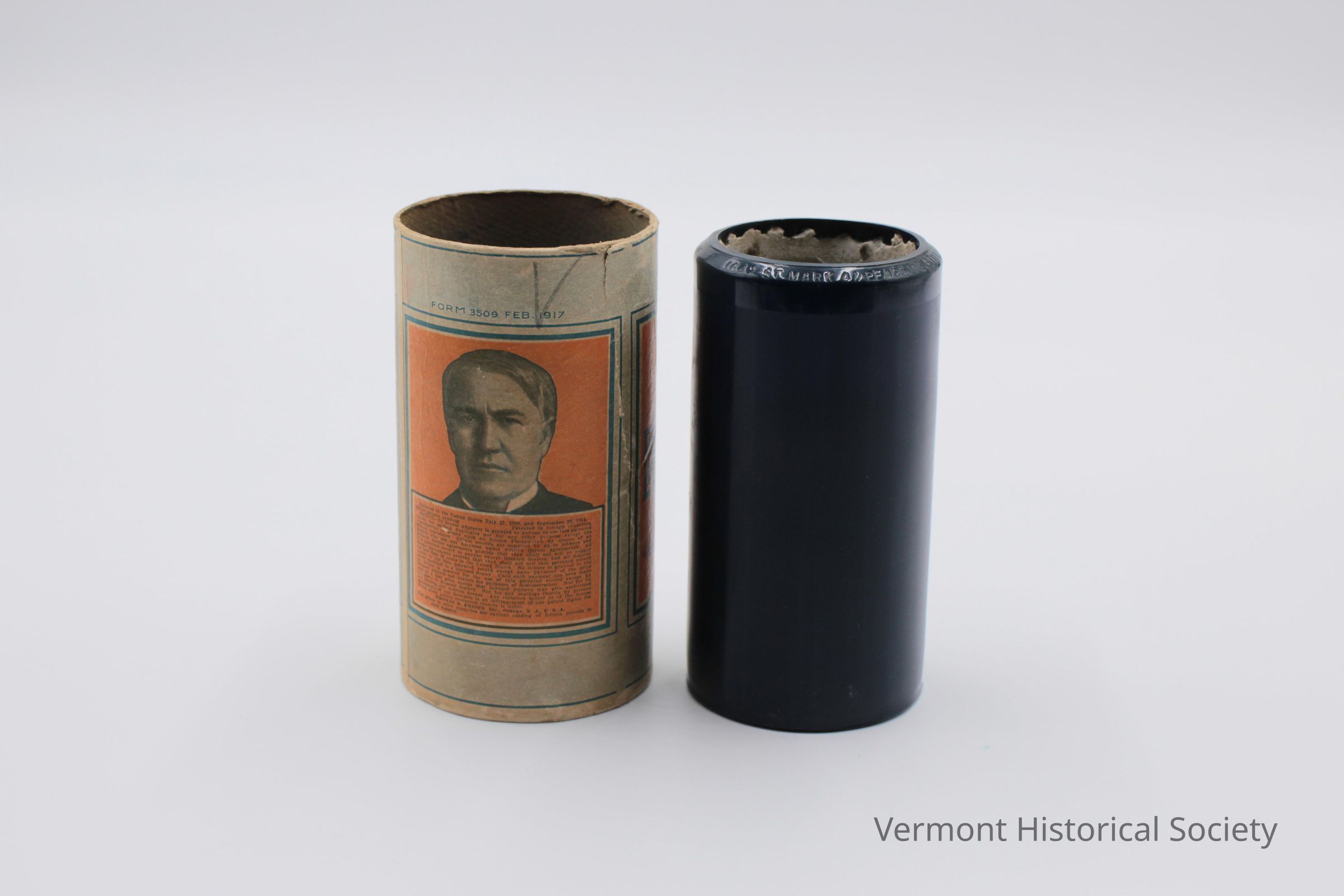 The cylinder is accompanied by a cardboard case. The case is labeled on one side with the words, "EDISON BLUE AMBEROL RECORD", in blue on an orange ground. The other side is printed with a photographic portrait of Thomas Edison above the patent and trademark information and the price (60 cents).Use
