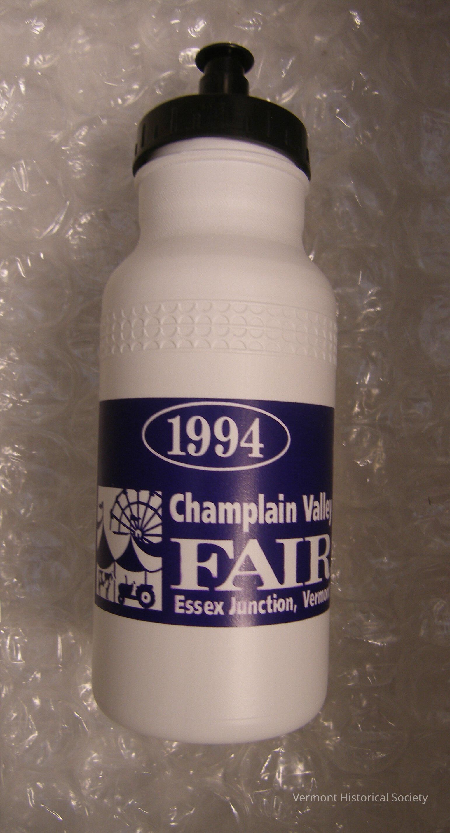 White plastic drinking bottle. It has a black plastic lid that screws onto the bottle with a central pop-up spout. The middle of the bottle is printed with a purple label with white words that read, "1994 / Champlain valley FAIR Essex Junction, Vermont," with an illustration of a fair scene that includes a Ferris wheel, a cow, a tractor, and tents.