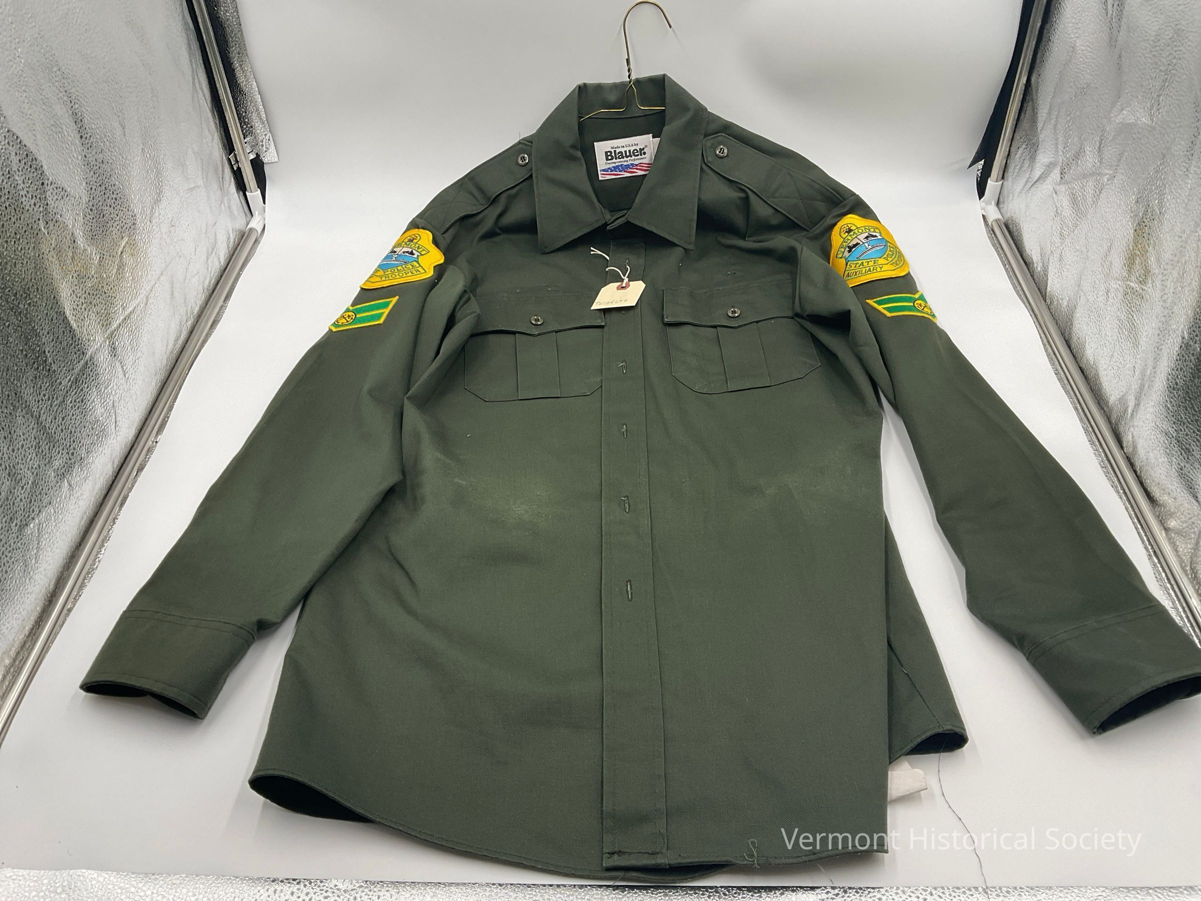 Dark green, long-sleeved short with collar, two breast pockets that button, epaulets and two yellow patches that say, "Vermont State Police, Auxiliary Trooper." Underneath are a pair of green stripes with crossed anchors in their center. The donor said the stripes were used for a short time when Lt. Alan Buck headed the Marine Division.Acquisition
