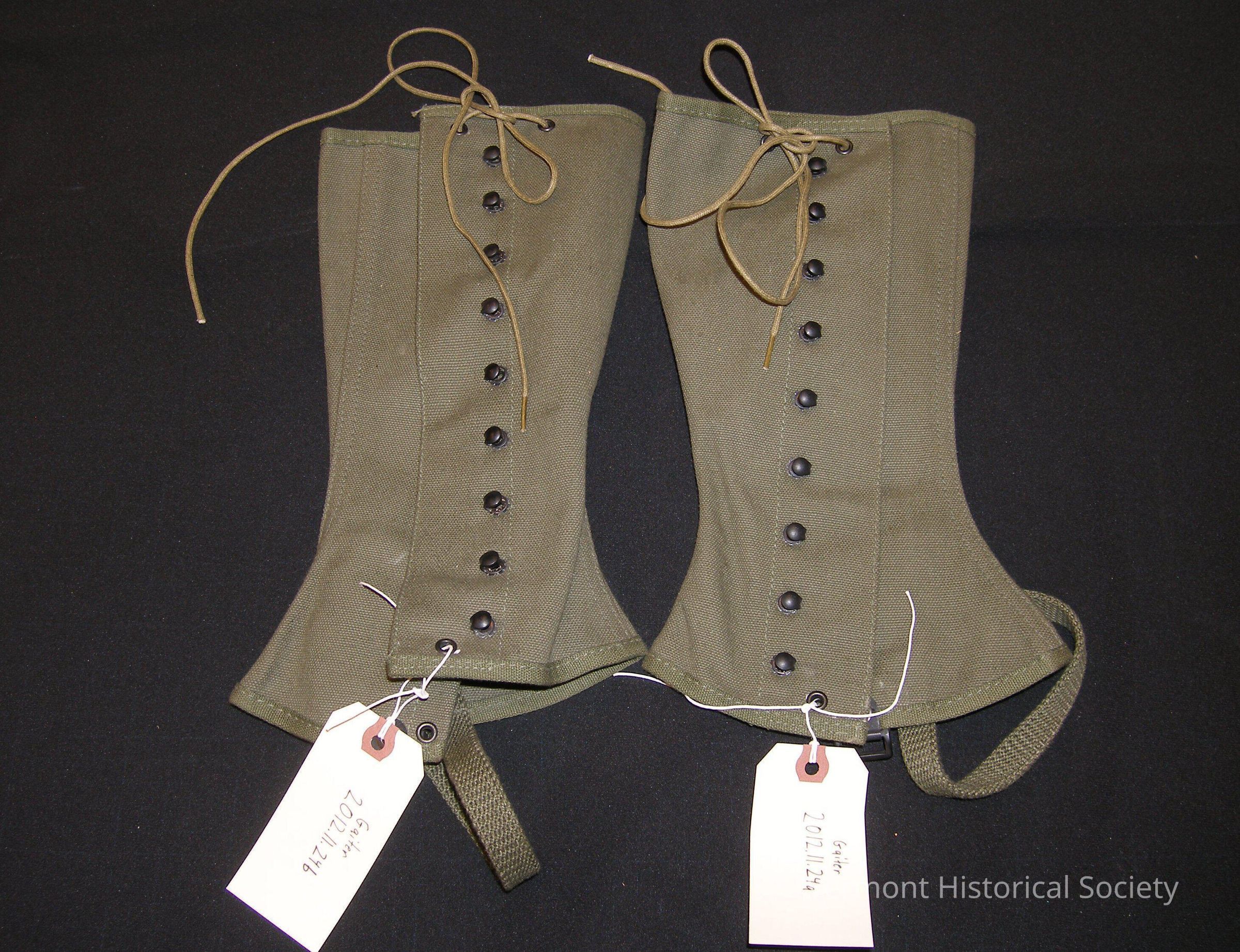 Pair of green canvas gaiters or leggings. Each has 13 metal grommets and 9 hooks that lace with string to close the leggings on the outside of the wearer's legs. There is a strap at the bottom of each legging that secures with a metal buckle. They appear to be in unused condition.Context
