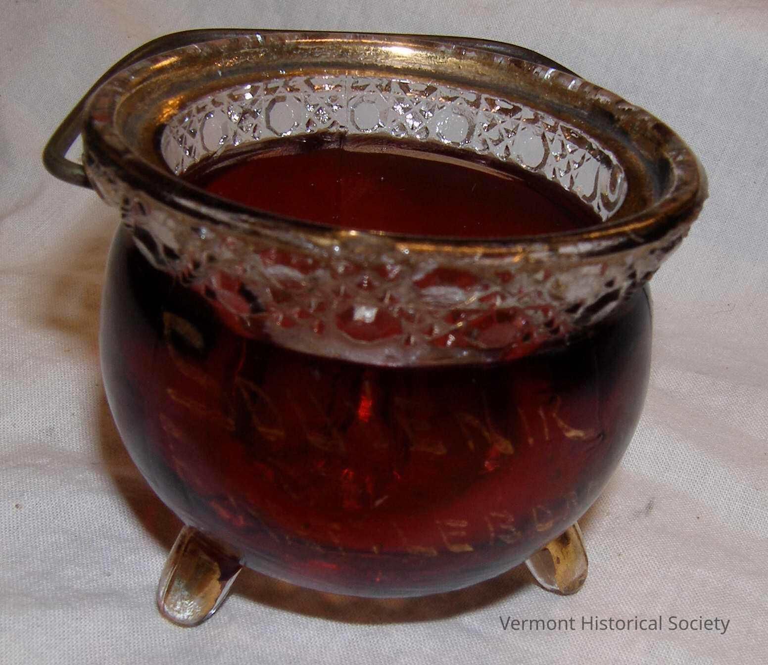 Glass toothpick holder shaped like a cauldron. There are three small fit, painted gold, and there is a gold stripe along the flared top rim. There is a wire handle that hinges upward. The round body of the cauldron is red and painted with the inscription, "Souvenir of Brattleboro".