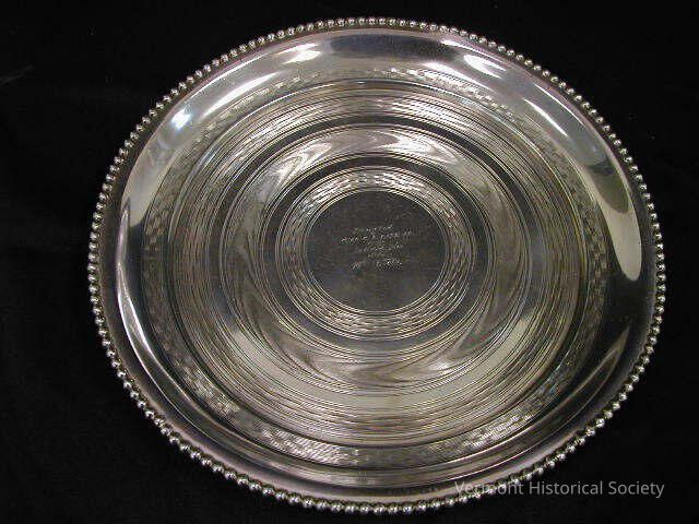 Round, silver-plated tray engraved at the center with the inscription, "Presented to SURG. C.B. PARK JR. by the Enlisted Men of the 16th Vt. Vols." The bottom of the dish is stamped, "ROGERS.SMITH & CO. NEW HAVEN CONN."Context
