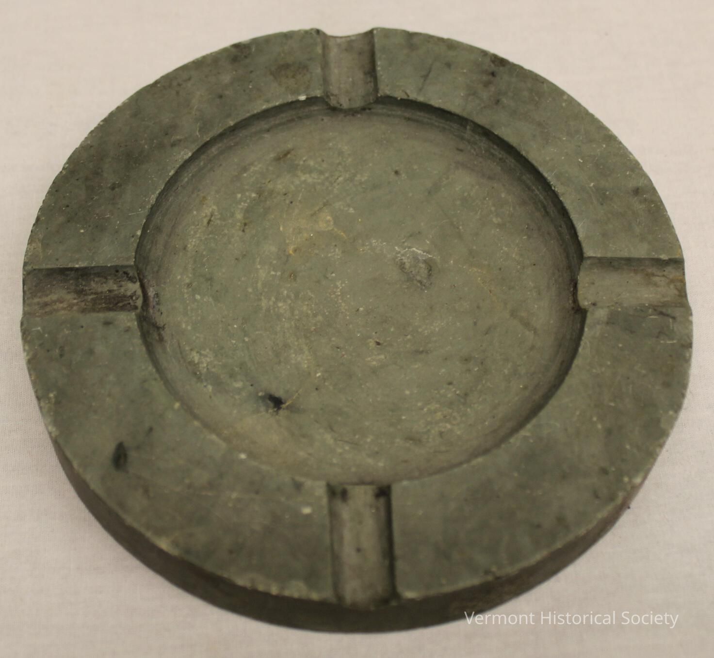 This carved slate ashtray has a natural gray finish. It features four cutouts for resting cigarettes, arranged around a shallow bowl in the center. There are no markings on the ashtray.