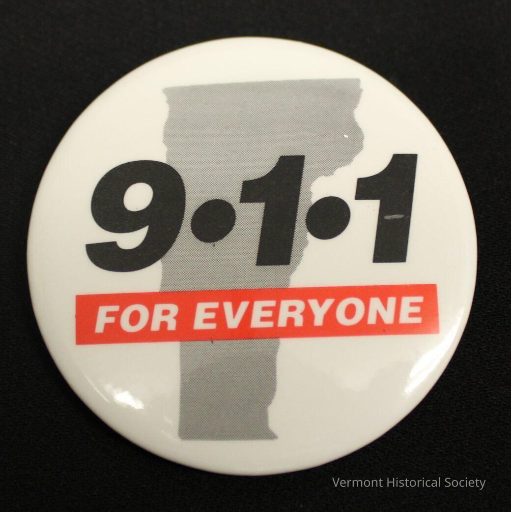 This button predates the establishment of a 911 system in Vermont, so was likely produced to campaign for one.Acquisition