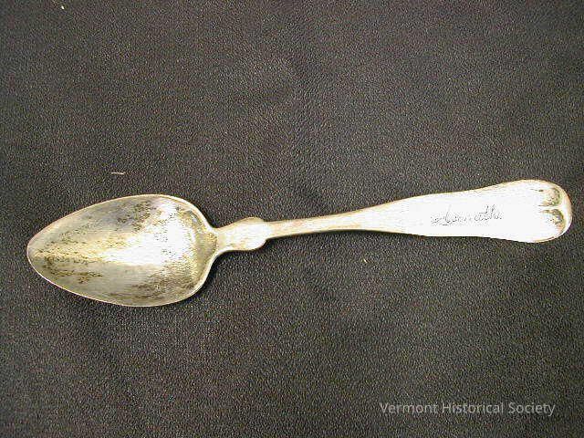 Coin silver spoon with a pointed bowl. The handle is engraved, "Asenath", and marked "A. A. Mead" on the reverse.Context