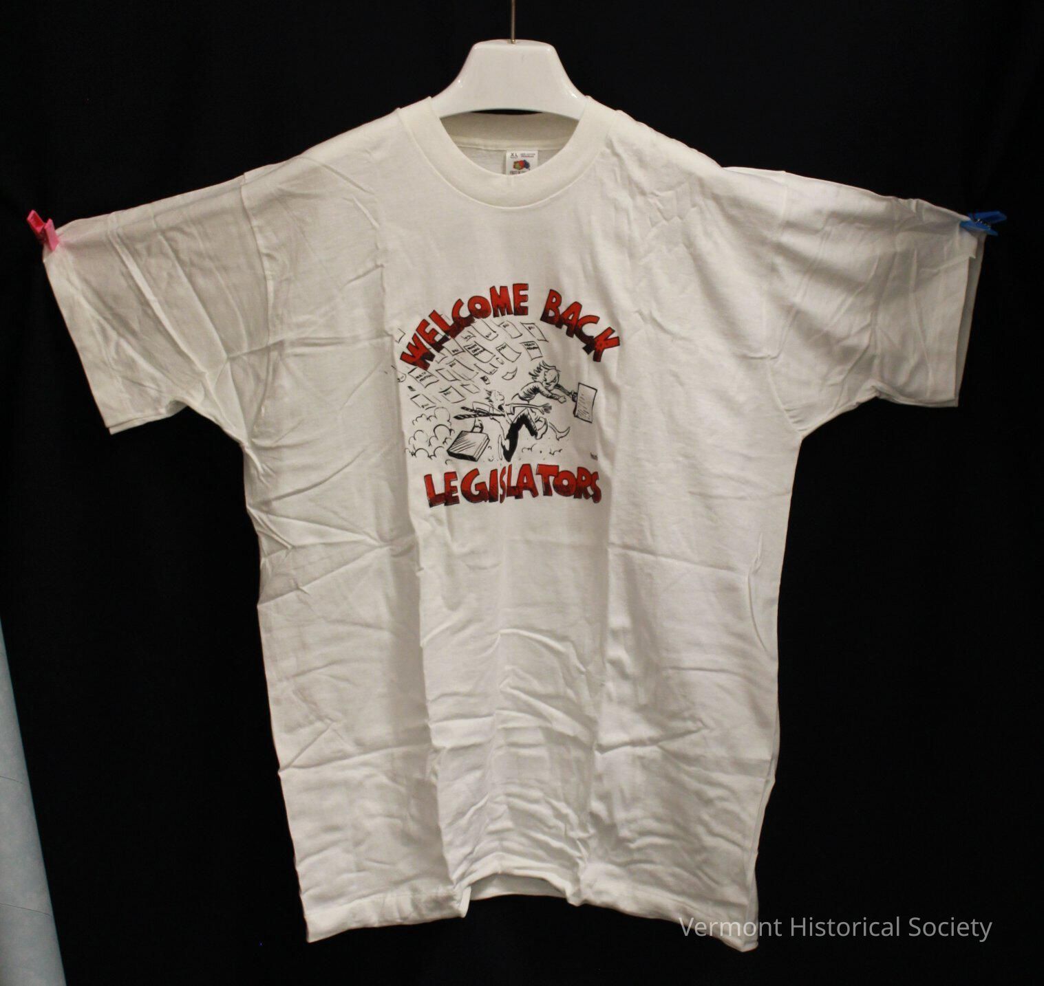 White cotton t-shirt printed at the center front chest with a comic-style illustration of 2 people (a man and a woman) running from flying pieces of paper. The illustration is surrounded by the words, "WELCOME BACK LEGISLATORS" in red and black.Context