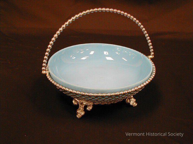 Cake basket consisting of a metal basket with a glass bowl insert. The metal basket is pierced all over with quatrefoil shapes, giving it a woven appearance. It sits on four ornate legs. A curved handle spans the center and is molded with beading. The glass bowl is opaque blue.