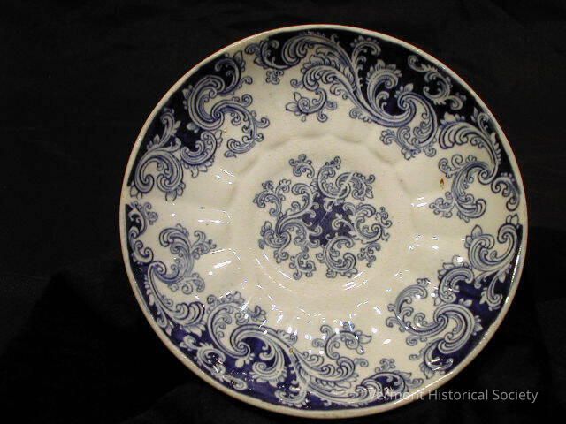 Blue-and-white transfer-printed saucer. The plate is decorated with a a swirling design around the border and at the center. The border of the saucer is molded into repeated facets. The back is labeled "GRANITE CHINA WR.S.&Co."
