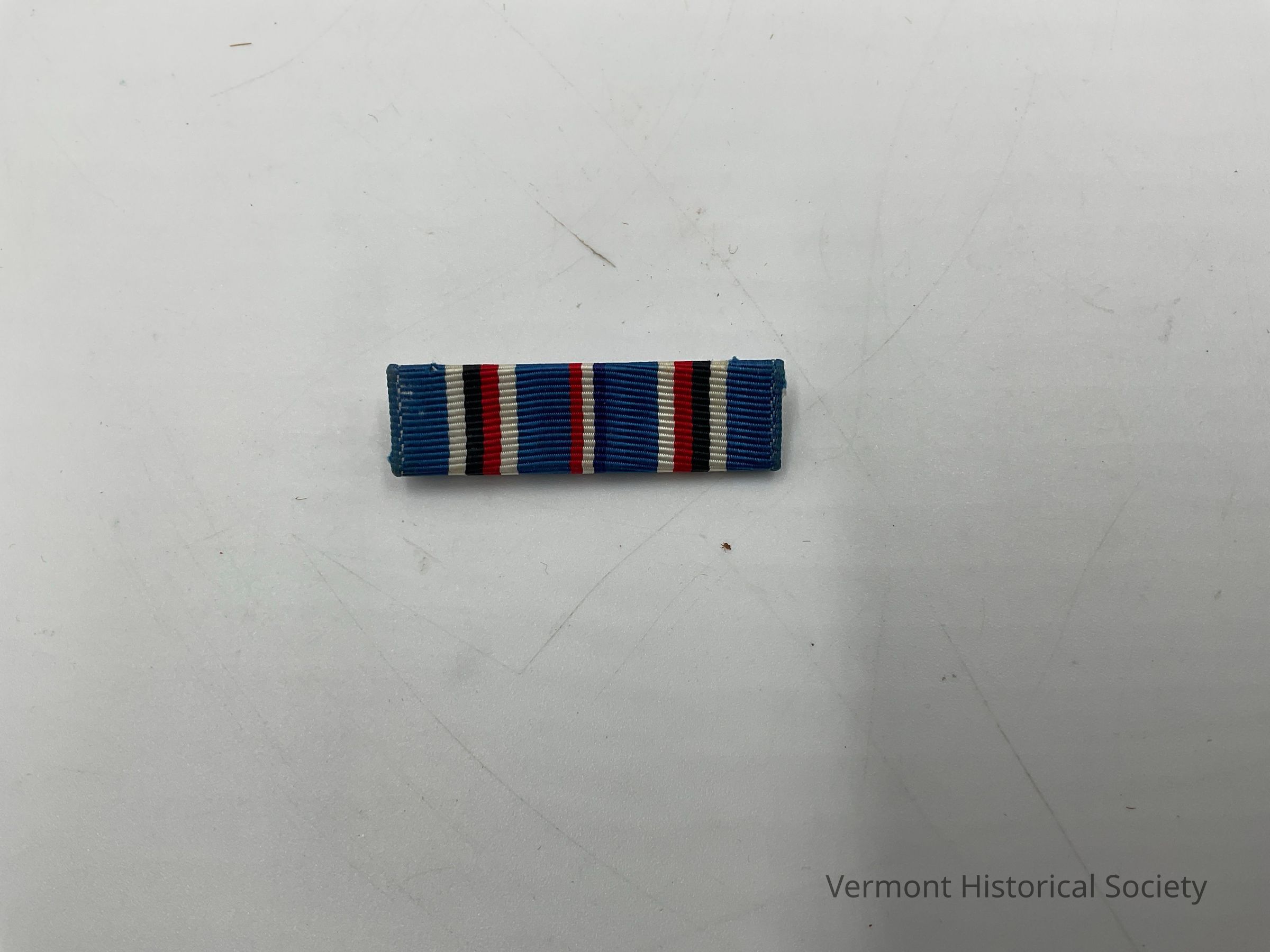 A rectangular bar pin with a blue, white, red and black ribbon around it. The pattern stands for American Campaign in World War II.Context