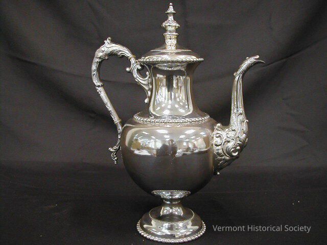 Ornate, silver-plated teapot with attached, hinged lid. The pot sits on a round pedestal, and the body is engraved with the inscription, "Presented to SURG. C.B. PARK JR. by the Enlisted Men of the 16th Vt. Vols." The handle is molded into a design of baroque leaves, as is the base of the spout.Context