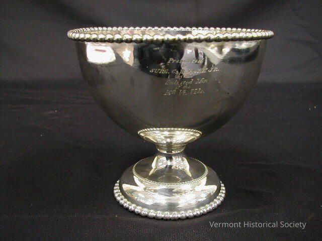 Round silver-plated waste bowl on pedestal. The rims of both the bowl and pedestal are beaded. The body is engraved with the inscription, "Presented to SURG. C.B. PARK JR. by the Enlisted Men of the 16th Vt. Vols."Context