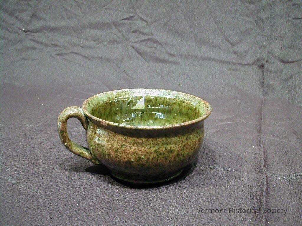Red-bodied ceramic porringer with mottled brown and green glaze.
