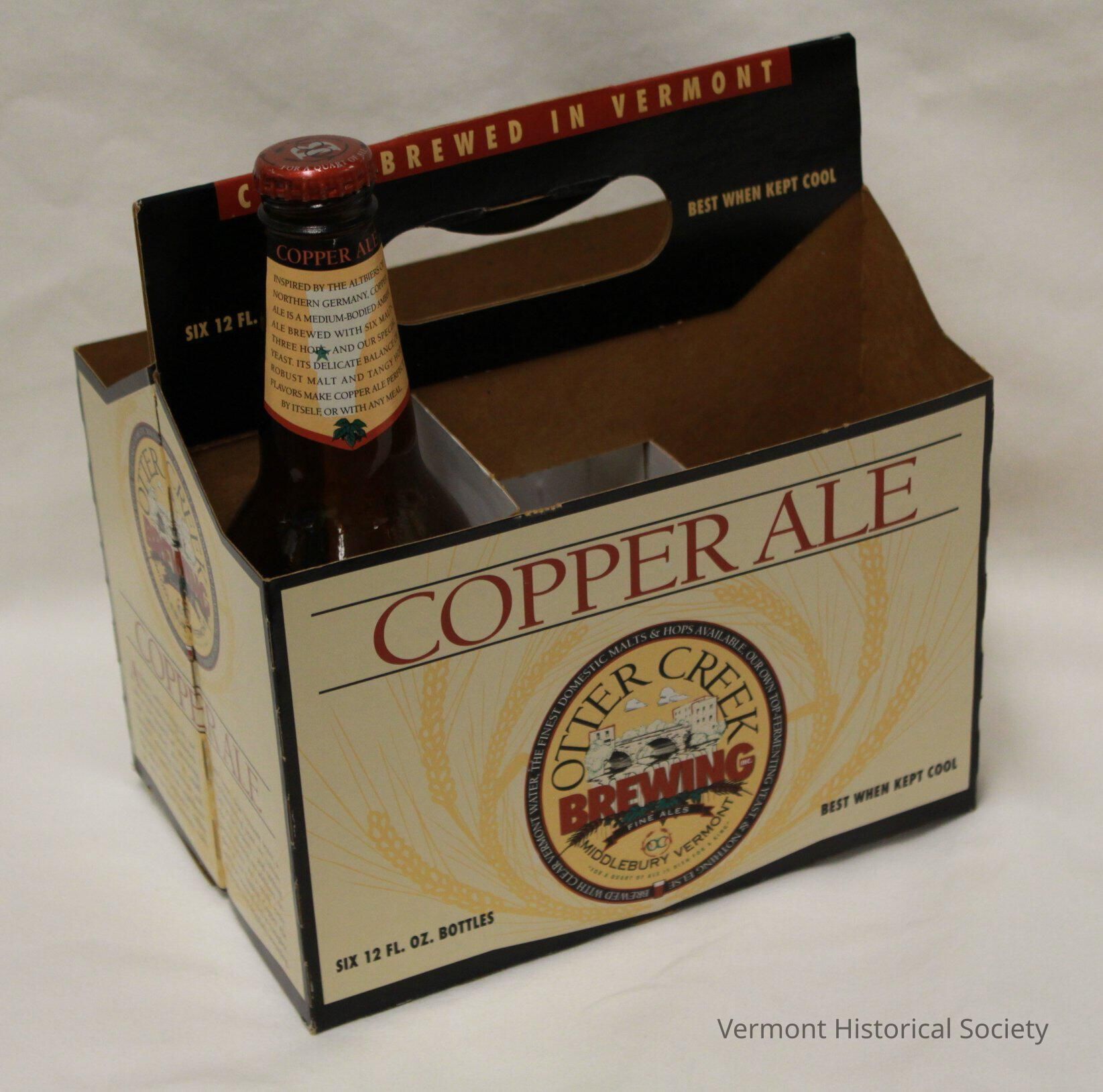 Single "Otter Creek Copper Ale" beer bottle (with screw on cap) and a paperboard 6-pack holder. "CRAFT BREWED IN VERMONT" Paper label on brown glass bottle. Label has an oval (vertical) logo "OTTER CREEK BREWING FINE ALES MIDDLEBURY VERMONT" "-FOR A QUART OF ALE IS DISH FOR A KING" "BREWED WITH CLEAR VERMONT WATER. THE FINEST DOMESTIC MALTS & HOPS AVAILABLE. OUR OWN TOP-FERMENTING YEAST & NOTHING ELSE." Center in the logo is a streetscape/bridge of the brewing complex.